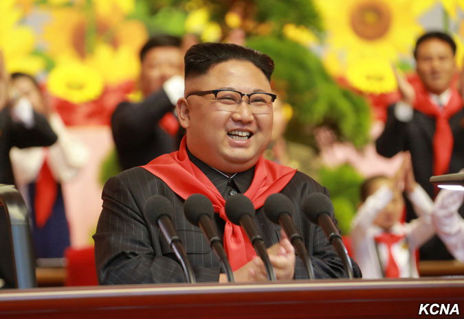 朝鲜少年团第八次大会现场 金正恩佩戴红领巾 |